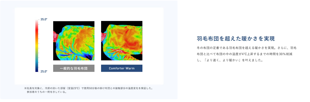 温度調整わた「THERMO FLEX®」の調温機能とレーヨンとアクリレート素材の調湿機能もそのままで、羽毛ならではの軽やかさと保湿性をプラスすることにより、《Comforter Warm》よりも約1.3倍の暖かさを実現しました。
