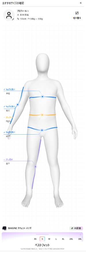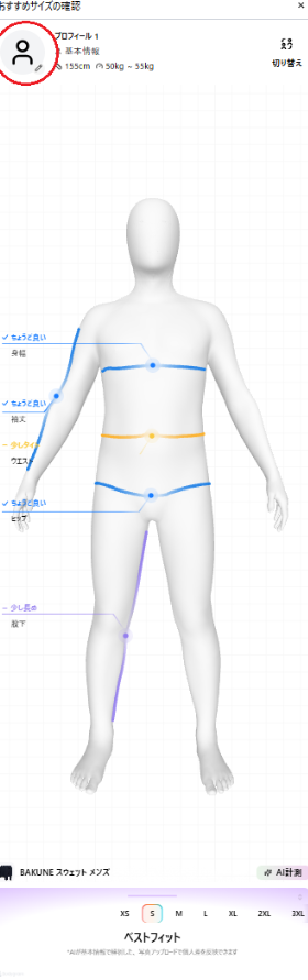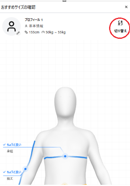 右上の切り替えアイコンから、自分用やギフト用のプロフィール(身長・体重・性別など)を登録・切り替えできます。